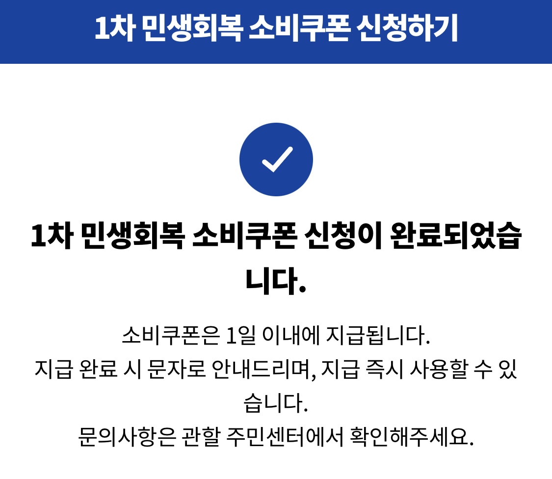 제가 신청한 방법은 지역 페이앱을 이용한 간편 신청이었어요. 지역페이로 접속하니, 민생회복지원금 배너가 떠 있었고 몇 가지 동의 절차를 거치니 1분도 안 돼서 신청 완료!