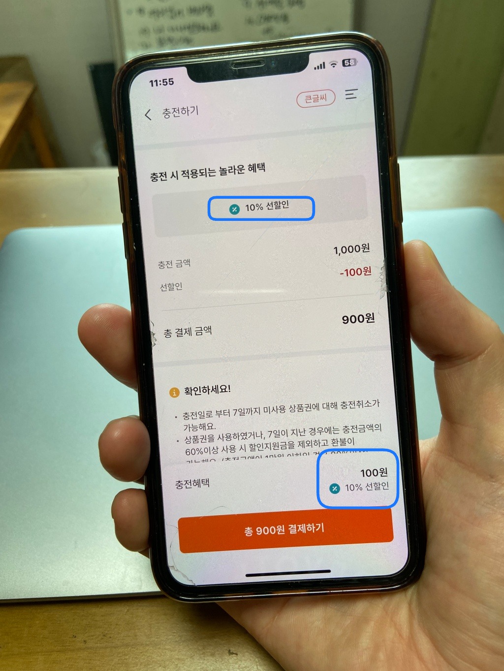 소액충전이 바로 실행됩니다. 1,000원 충전을 시도하면, 실제로 통장에서 빠져나가는 금액은 900원이죠. 선할인 -10% 가 되는 것입니다. 괜찮은 서비스아닌가요? 명절 때, 전통시장에서 장 봐야하는 분들이라면, 어차피 써야하는 금액이라면 디지털 온누리 상품권을 활용하시는 것을 추천합니다.