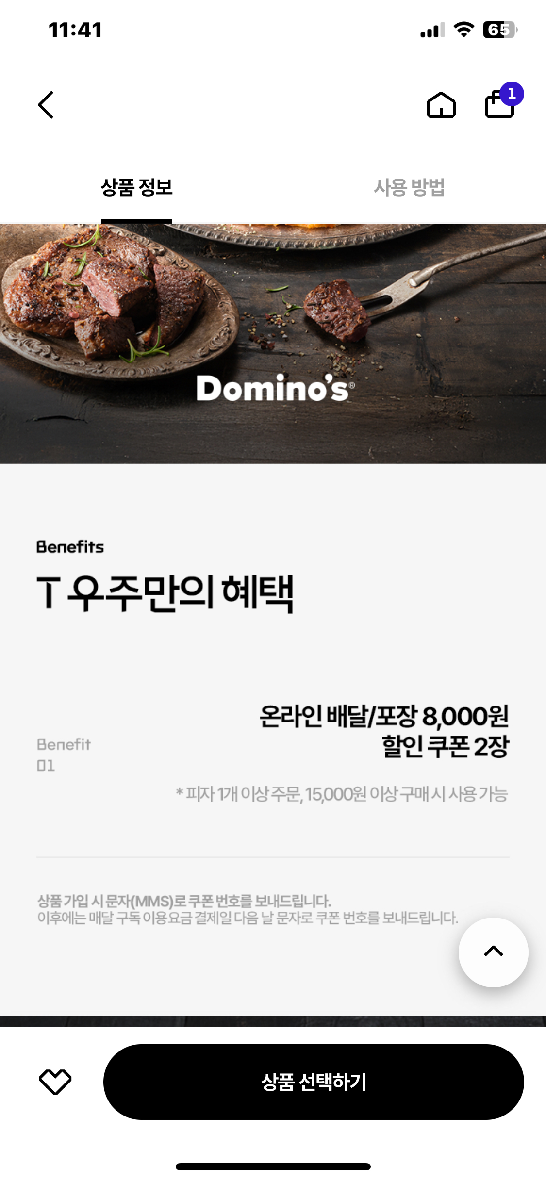 SKT 맴버십에서 도미노 피자를 조회해보니, 온라인 배달/ 포장 8,000원 할인쿠폰 2장이 나옵니다. 어떻게 사용하나 봤더니, SKT 맴버십에서 자신이 원하는 상품을 구입할 때, 도미노피자 할인쿠폰 2장을 함께 구입할 수 있습니다. 즉, SKT 맴버십에서 뭔가를 구입하게되면 사은품으로 쿠폰을 증정하는 방식입니다.
